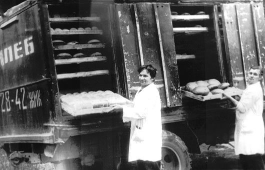 Завантаження лотків в хлібну машину. (Фото 60-х років)